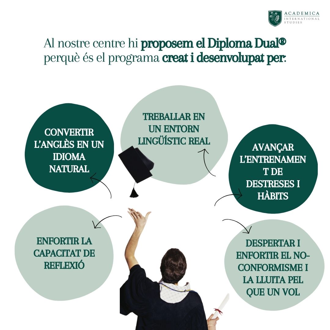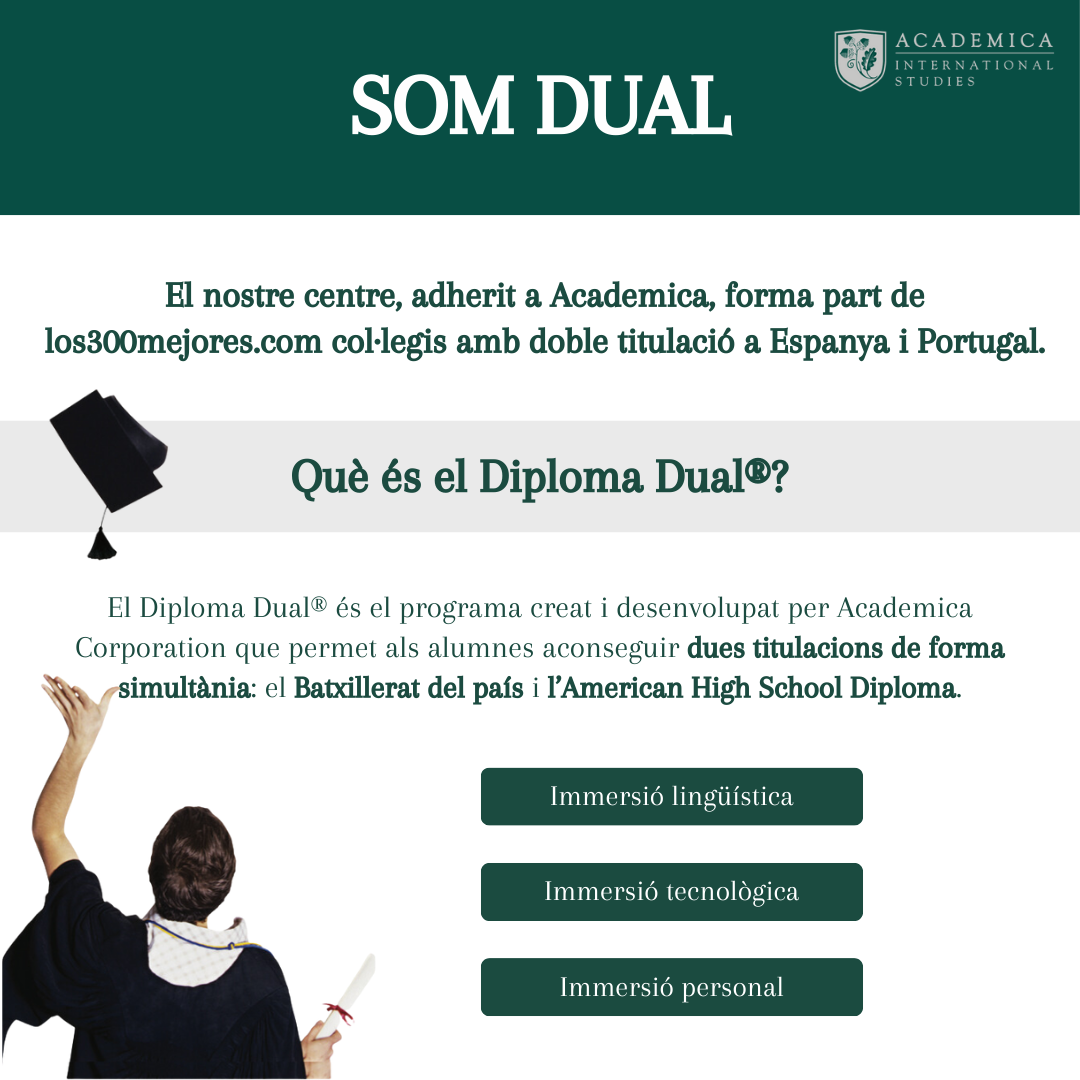 El Diploma Dual® és el programa oficial de convalidació internacional de títols de batxillerat creat i desenvolupat per Academica Corporation, que permet als alumnes obtenir 2 titulacions simultànies: la pròpia del seu país (el Batxillerat a Espanya, el Baccalauréat a França, la Scuola Secondaria a Itàlia…) i l’American High School Diploma.